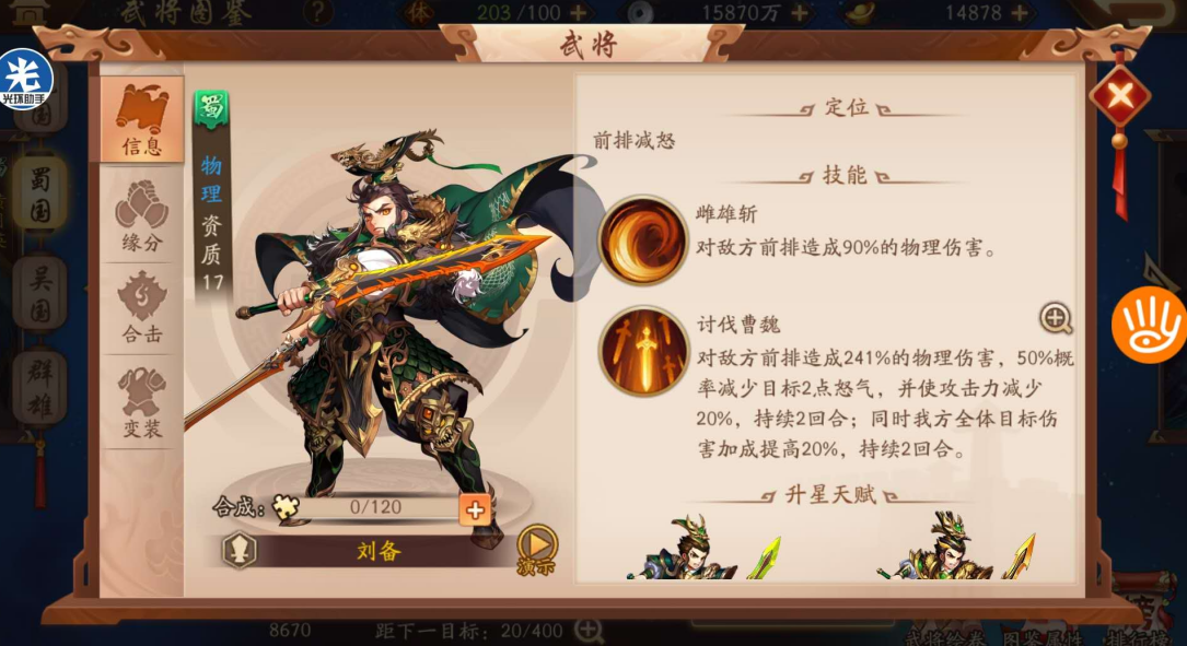 输出武将优先选高爆发、增伤类战法,虹金品质的合纵连横适配性极强,造成伤害时目标生命越低增伤越高,回合末还能获得已损失生命35%的护盾,兼顾收割与续航,同列友军可分摊伤害并降低敌方属性,同排武将虹御伤害大幅提升,适合赵云、夏侯惇这类核心输出;赤金的赤霄金乌主打日炎灼烧与防御削弱,不可清除的持续真实伤害能稳定压制血线,还可清除敌方增益,适配吴国灼烧流与群雄爆发流;紫金的祸蛊普攻触发概率高,锁定敌方生命最高单位持续下血,适合副输出补伤害,资源有限时可优先兑换稳定获取的犀甲,生命低于一半时提升防御与格挡,给前排输出兼坦度的武将佩戴,能大幅提升生存能力。